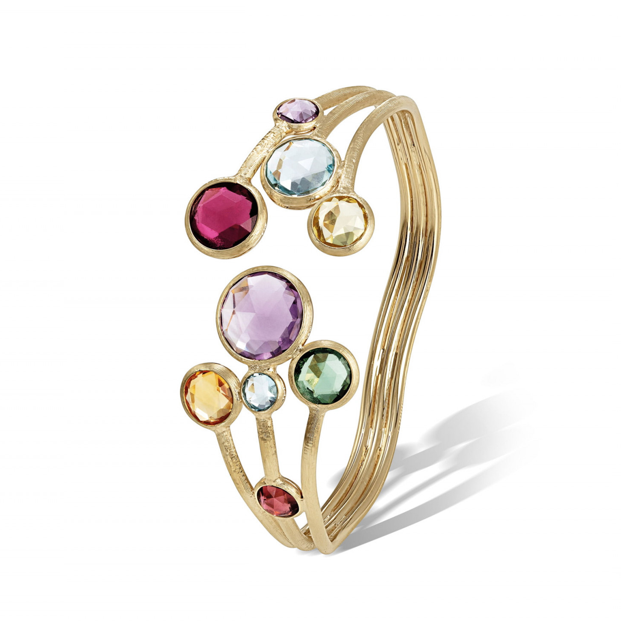 Dieser reizvoll schlichte Armreif besteht aus einer erlesenen Auswahl bunter Edelsteine in einer Ringfassung aus 18-karätigem Gelbgold, die von Hand mit der traditionellen Fadensticheltechnik graviert ist.